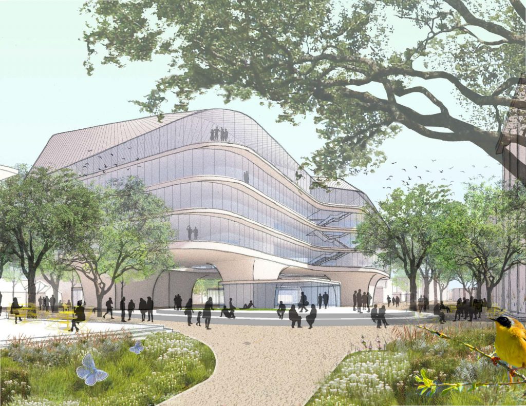 In an effort to create a civic hub at the site, Studio Gang architects employed an open design, including easily accessible board chambers that can be used for other events, topographic changes throughout the site and a scalloped roof design allowing sunlight to reach pedestrian paths.